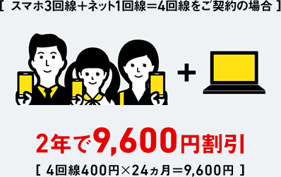 - 割引の上限回線数は、「おうち割 九州電力 でんきセット(M)」にて固定通信サービス/スマートフォン/ケータイ/タブレット/モバイルWi-Fiルーターより最大10回線。ソフトバンク指定の携帯電話、通信機器、固定通信サービスまたは料金プランのご契約が必要です。詳細はこちら。