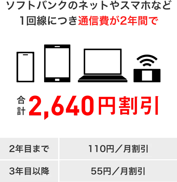 ※おうちでんきにご加入の場合、ご契約の携帯電話・タブレット・固定通信サービス10回線まで1回線ごとに110円/月割引(2年間)が適用となります。3年目以降の割引金額は55円/月です。