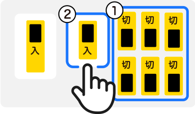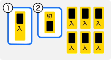 ①漏電遮断器のつまみを「入」にしたあと、②配線用遮断器のつまみを一つずつ「入」にしてください。