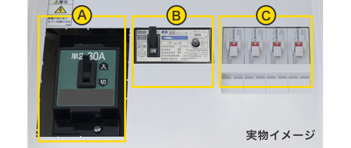 ①アンペアブレーカーのつまみが「入」に、②漏電遮断器が「切」になっていることをご確認ください。