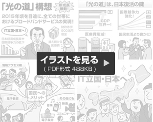 政府が掲げる「光の道」構想は、全国に光ファイバー網を整備し、日本の経済や社会システムを抜本的に効率化させ、新たな成長戦略を描こうというものです。 2010年6月18日に日本の新成長戦略が発表され、日本復活の鍵として「光の道」構想の実現が挙げられました。そして同年8月31日には「光の道」戦略大綱として、インフラ整備・利活用の加速化を通じ、2015年頃を目途に、すべての世帯におけるブロードバンドサービス利用の実現を目標とするものであることが発表されました。