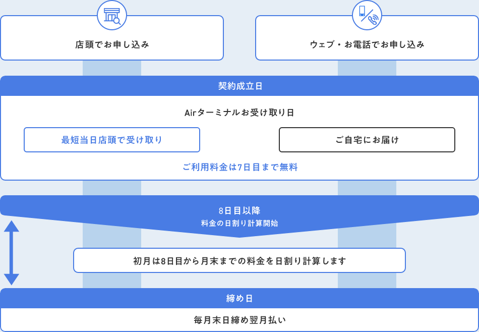 SoftBank Airのご利用料金は契約成立日の翌日を1日目として8日目からかかります。ご請求は月末締め翌月払いになります。