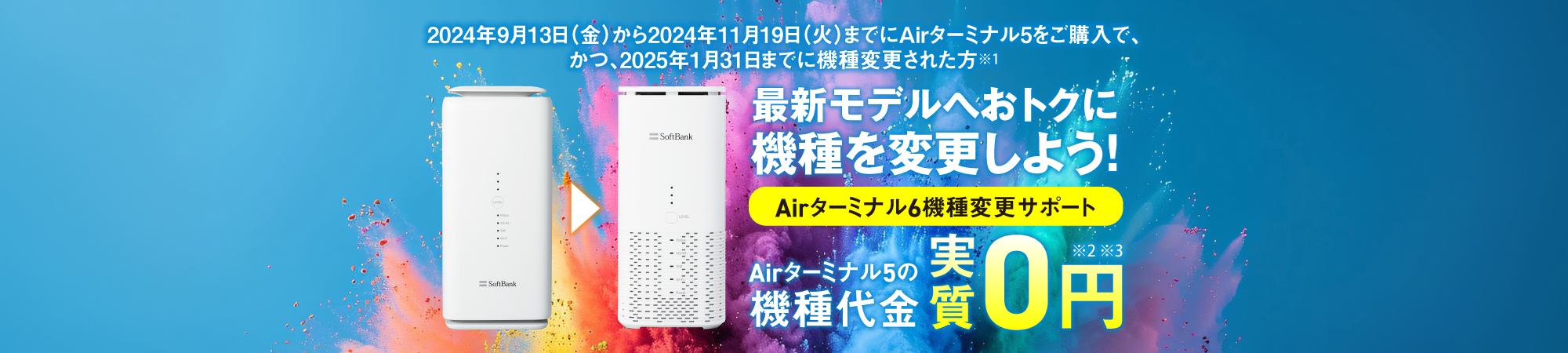 2024年11月20日(水)から2025年1月31日(金)までに、「Airターミナル5」(以下「対象Air5」といいます)から「Airターミナル6」(以下「対象Air6」といいます)へ購入により機種変更された方が対象です。