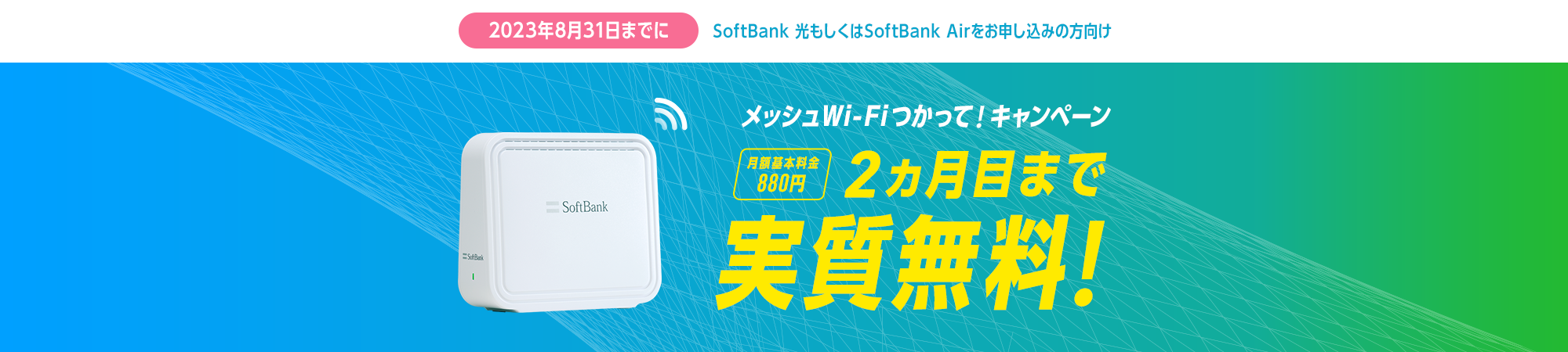 2023年8月31日以前に「SoftBank 光」および「SoftBank Air」(以下、「対象サービス」といいます。)またはそのいずれかにお申し込みいただいているお客さまが、ソフトバンク株式会社(以下「当社」といいます。)指定の窓口にて新たにメッシュWi-Fi(当社が提供するメッシュWi-Fiルーター2台セット※1を標準で提供するオプションサービスで、以下「対象オプション」といいます。)にお申し込みいただき、以下の適用条件をすべて満たした場合に後記の特典を提供するキャンペーンです。