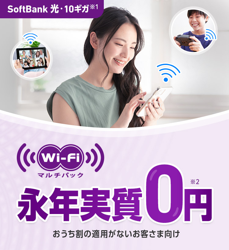 「SoftBank 光・10ギガ Wi-Fiマルチパック ずーっと割」(以下「本キャンペーン」といいます)は、ソフトバンク株式会社(以下「当社」といいます)指定の窓口にて、「対象サービス」における「Wi-Fiマルチパック」(以下「対象オプション」といいます)へお申し込みいただき、以下の適用条件をすべて満たした場合に、後記の特典を提供するキャンペーンです。