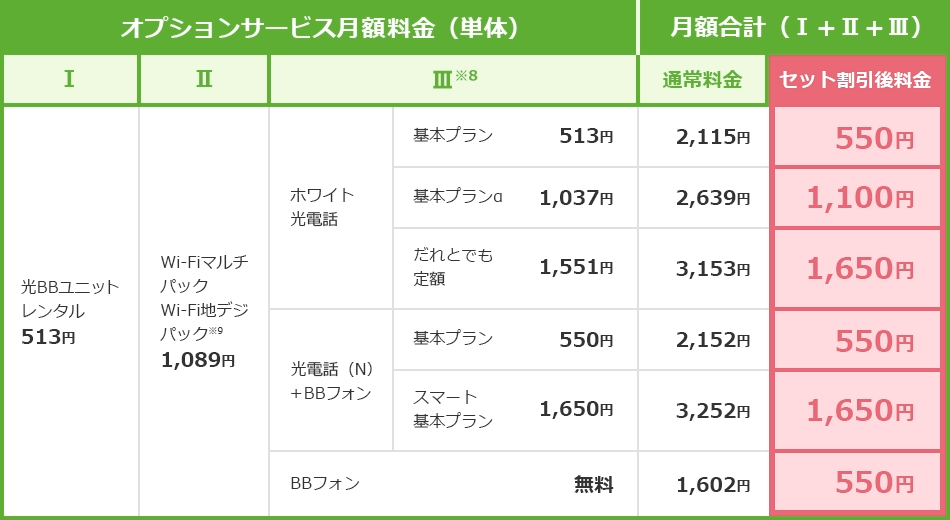 - ※2光BBユニットレンタル(月額513円)、Wi-Fiマルチパック(月額1,089円)、ホワイト光電話 基本プラン(513円)の合計です。 選択いただいたオプションサービスによって金額は変動します。