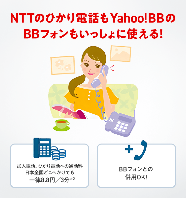 - Yahoo! BBのお申し込みと同時に「ひかり電話機能」にお申し込みをされる場合、こちらからお申し込みいただけます。
