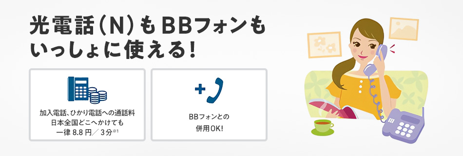 - ホームゲートウェイ(S)とBBフォンまたは光電話(N)をご利用の場合、光電話機能は無料で提供いたします。