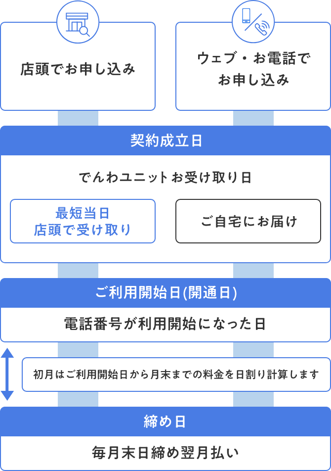 おうちのでんわのご利用料金はご利用開始日(開通日)からかかります。ご請求は月末締め翌月払いになります。