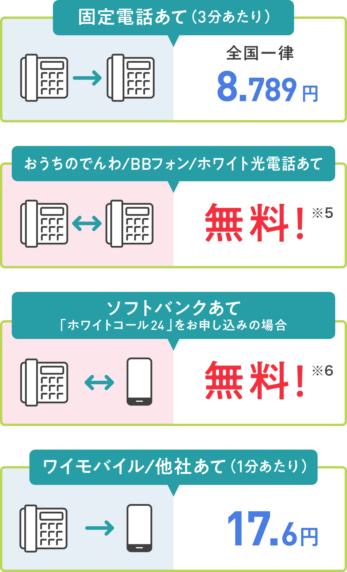 通話相手先が国内固定電話の場合、全国どこでも同じ金額でご利用いただけます。ソフトバンクが提供する電話サービスの場合、距離・時間帯を問わず無料となります。