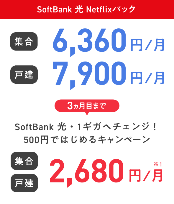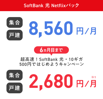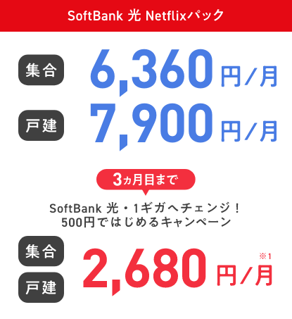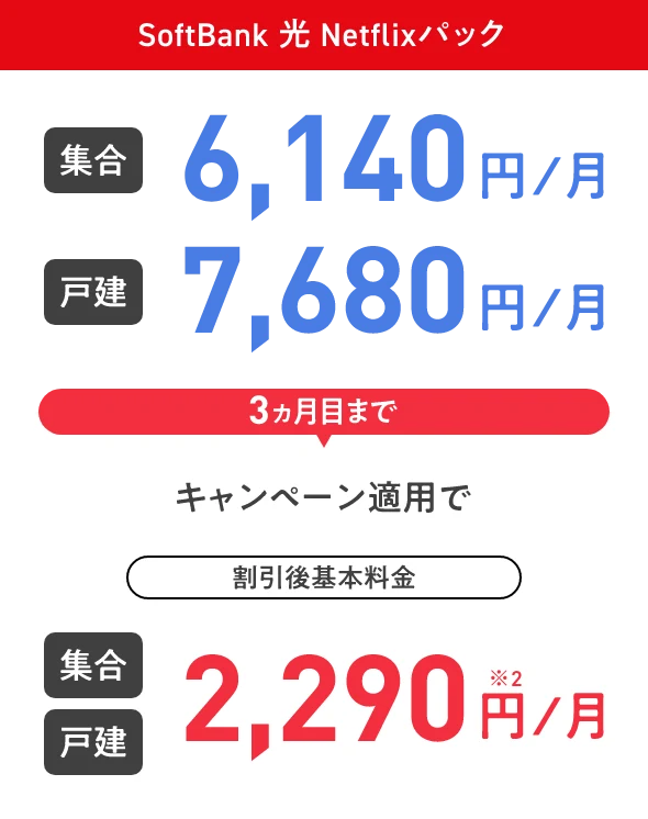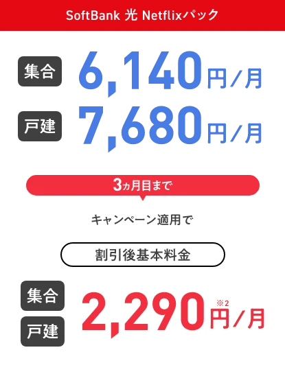 SoftBank光 Netflixパック 集合 6,140円/月 戸建 7,680円/月 3ヵ月目まで キャンペーン適用で 割引後基本料金 集合 戸建 2,290円※2/月 SoftBank光 Netflixパック 集合 6,140円/月 戸建 7,680円/月 3ヵ月目まで キャンペーン適用で 割引後基本料金 集合 戸建 2,290円※2/月
