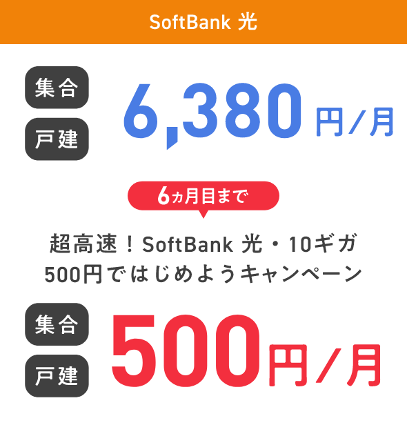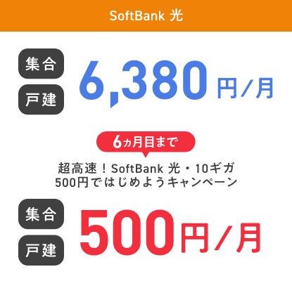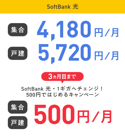 SoftBank光 集合 4,180円/月 戸建 5,720円/月 3ヵ月目まで キャンペーン適用で 割引後基本料金 集合 戸建 割引後基本料金 0円※1/月 SoftBank光 集合 4,180円/月 戸建 5,720円/月 3ヵ月目まで キャンペーン適用で 割引後基本料金 集合 戸建 割引後基本料金 0円※1/月