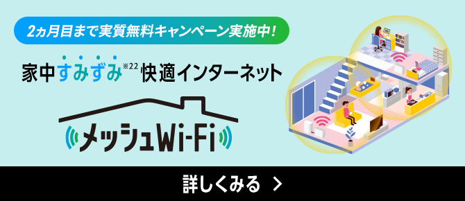 • メッシュWi-Fiルーターの電波が届く範囲および実効速度は、周囲の電波状況や住宅の構造など利用環境により大きく異なります。