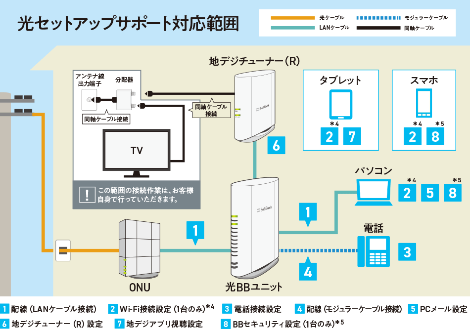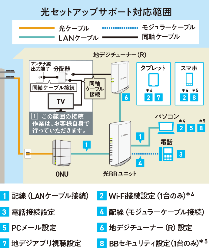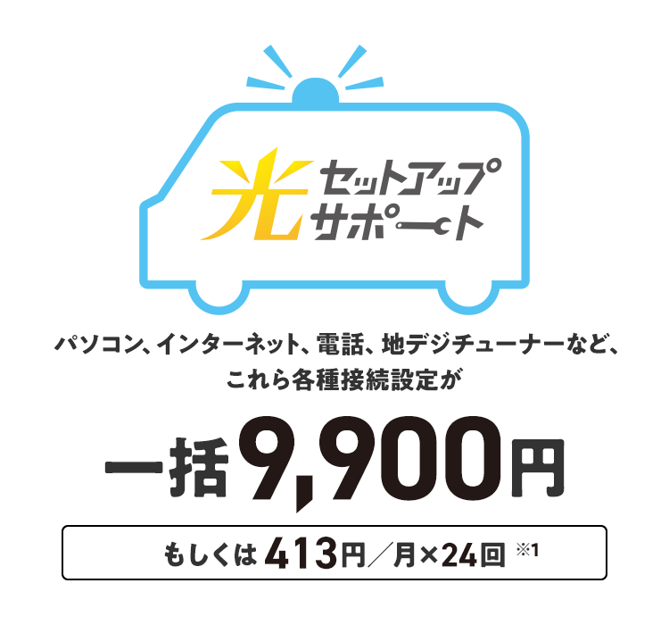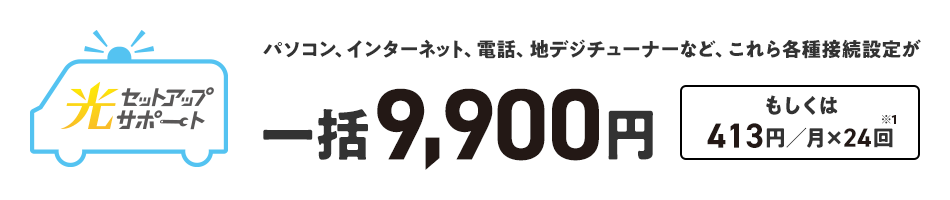 - 離島にお住まいのお客さまが「光セットアップサポート」を申し込まれた場合、別途交通費が発生する場合があります。