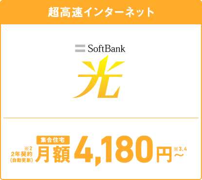 - ※1[加入例]SoftBank 光 ファミリー(2年契約自動更新プラン)の場合、月額基本料金5,720円/月(契約期間満了月の当月・翌月・翌々月以外での解約には解除料5,720円が必要)。