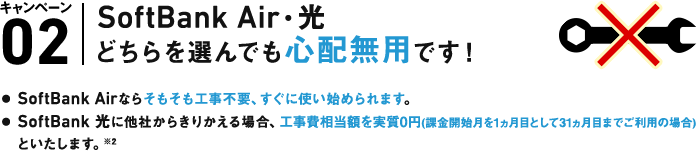 - ※2SoftBank 光の契約期間は2年間(自動更新)です。契約期間満了月の当月・翌月・翌々月以外で解約した場合、解約時の契約プラン・回線タイプに応じた割引前の月額利用料金相当額の解除料が必要です。詳細はウェブにてご確認ください。 なお、ブロードバンドサービスと付随するオプションサービスを同月内に解約し解除料が重複して発生する場合は、11,000円を解除料の上限金額としてお支払いいただきます。