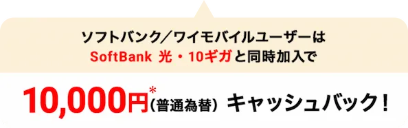 - ※1「SoftBank 光・10ギガ もっとめちゃトク割」適用時。「SoftBank 光・10 ギガ めちゃトク割」と併用した場合 。「SoftBank 光・10 ギガ もっとめちゃトク割」については、SoftBank 光から SoftBank 光・10 ギガへの変 更は対象外です。 SoftBank 光 自動更新なしプランは対象外です。また、申込時点で同住所・同名字での「SoftBank 光」および「SoftBank Air」または、そのいずれかのサービスの契約がないこと等、適用条件があります。