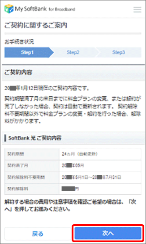 案内に順じて、現在のご契約状況、解約する場合の費用や注意事項等を確認してください