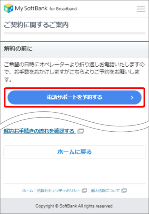 お客様のご契約状況によっては電話サポートではなく、My SoftBankからそのまま解約可能な場合がございます。その際はお電話頂く必要はございません。