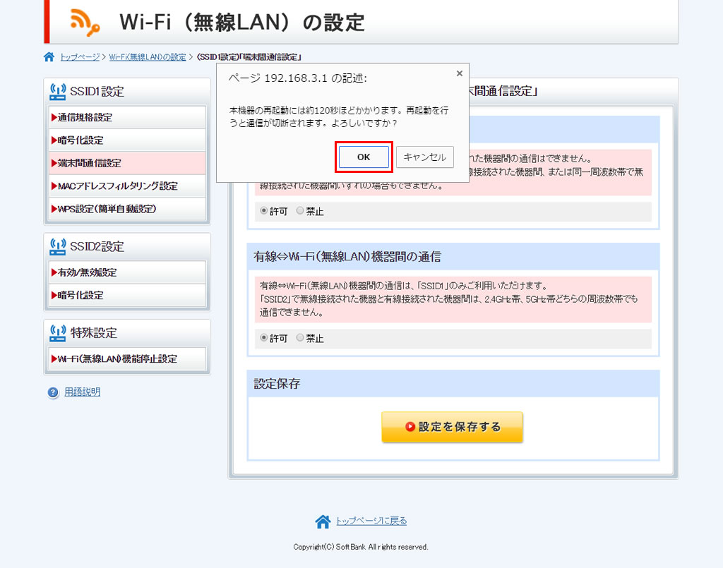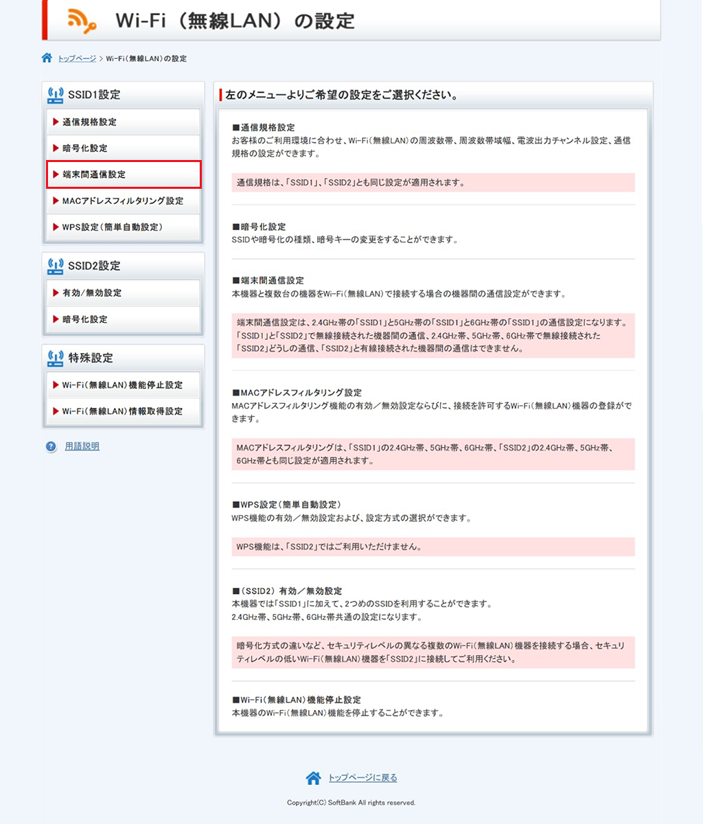 SSID1に接続している無線LAN機器同士の通信、または、有線LANで接続されている機器とSSID1に接続している無線LAN機器間の通信を許可/禁止する設定ができます。