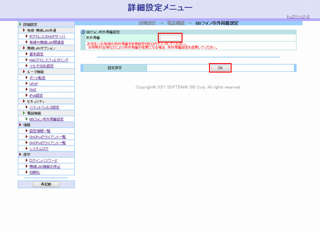 お住まいの地域の市外局番を入力し、[OK]をクリックします。