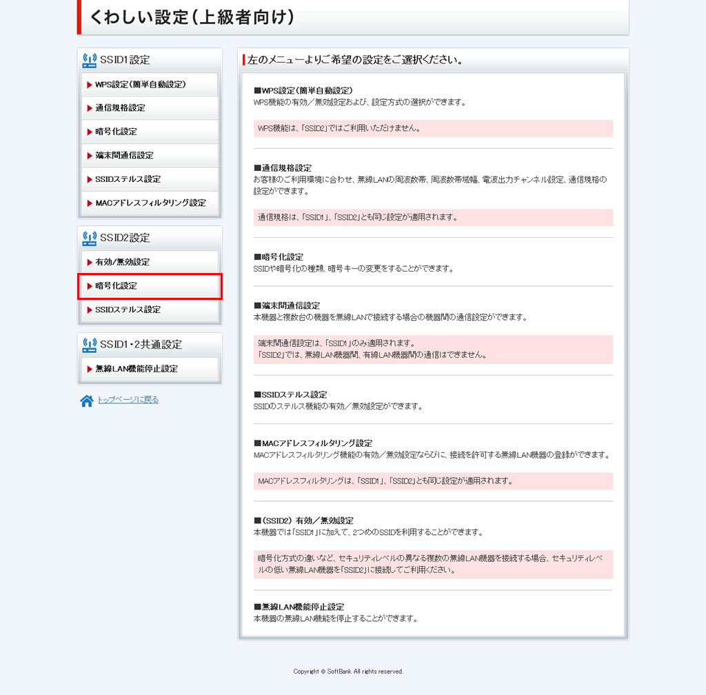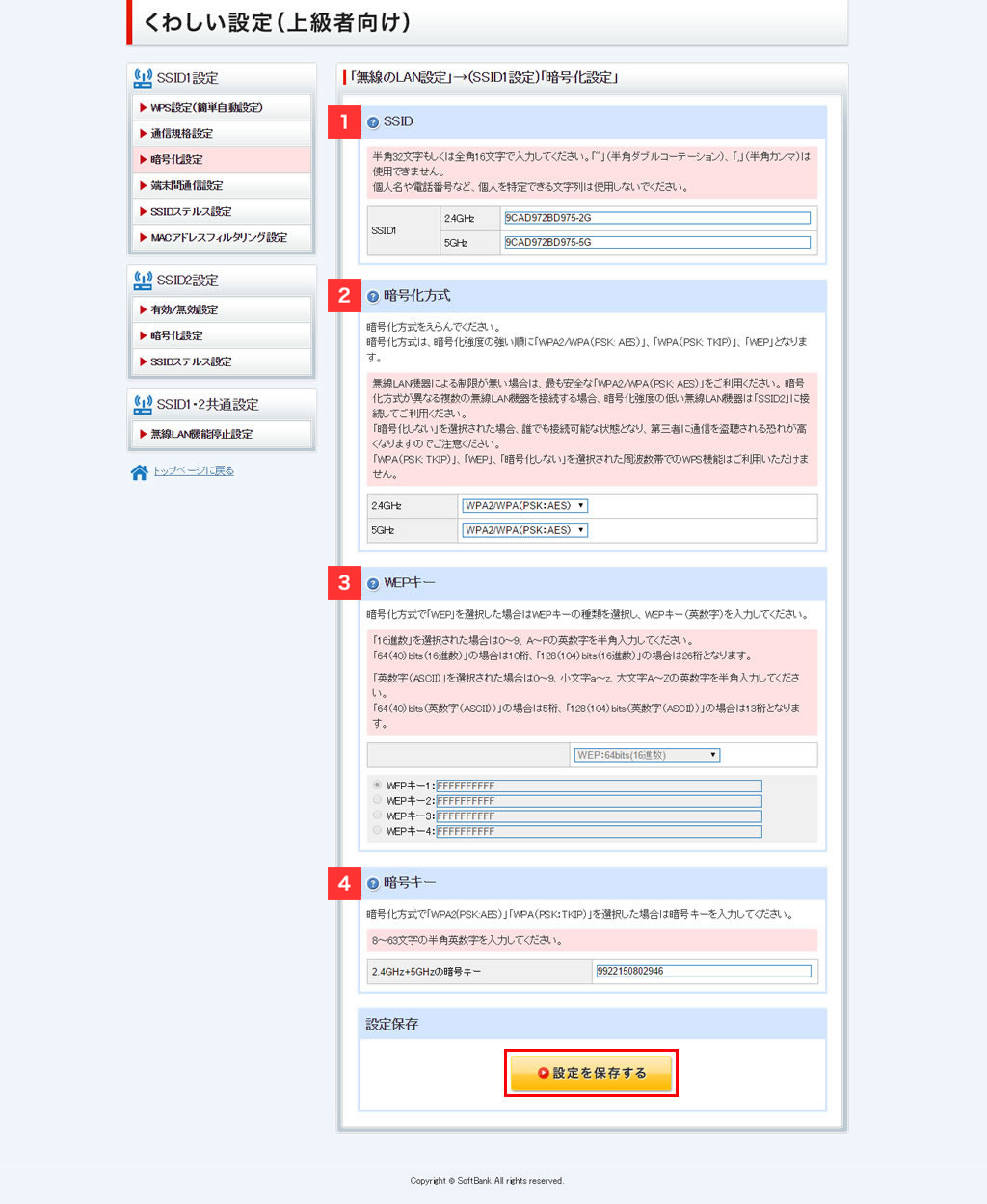 本項では、SSIDや暗号化の種類、暗号キーの変更をすることができます。