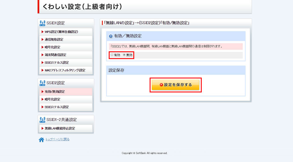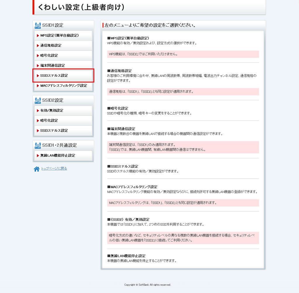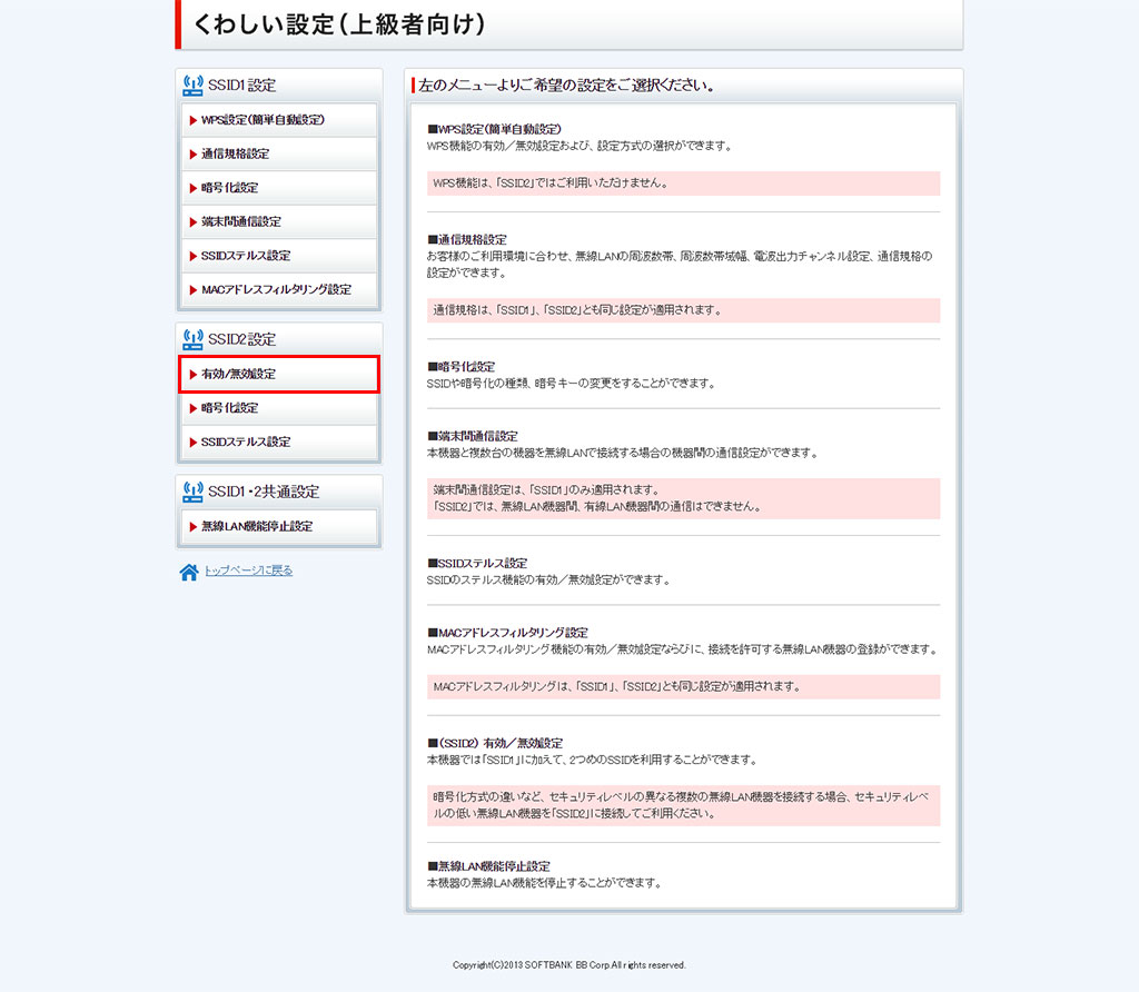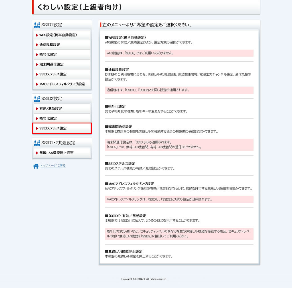 本項では、SSID2のステルス機能の有効/無効設定ができます。