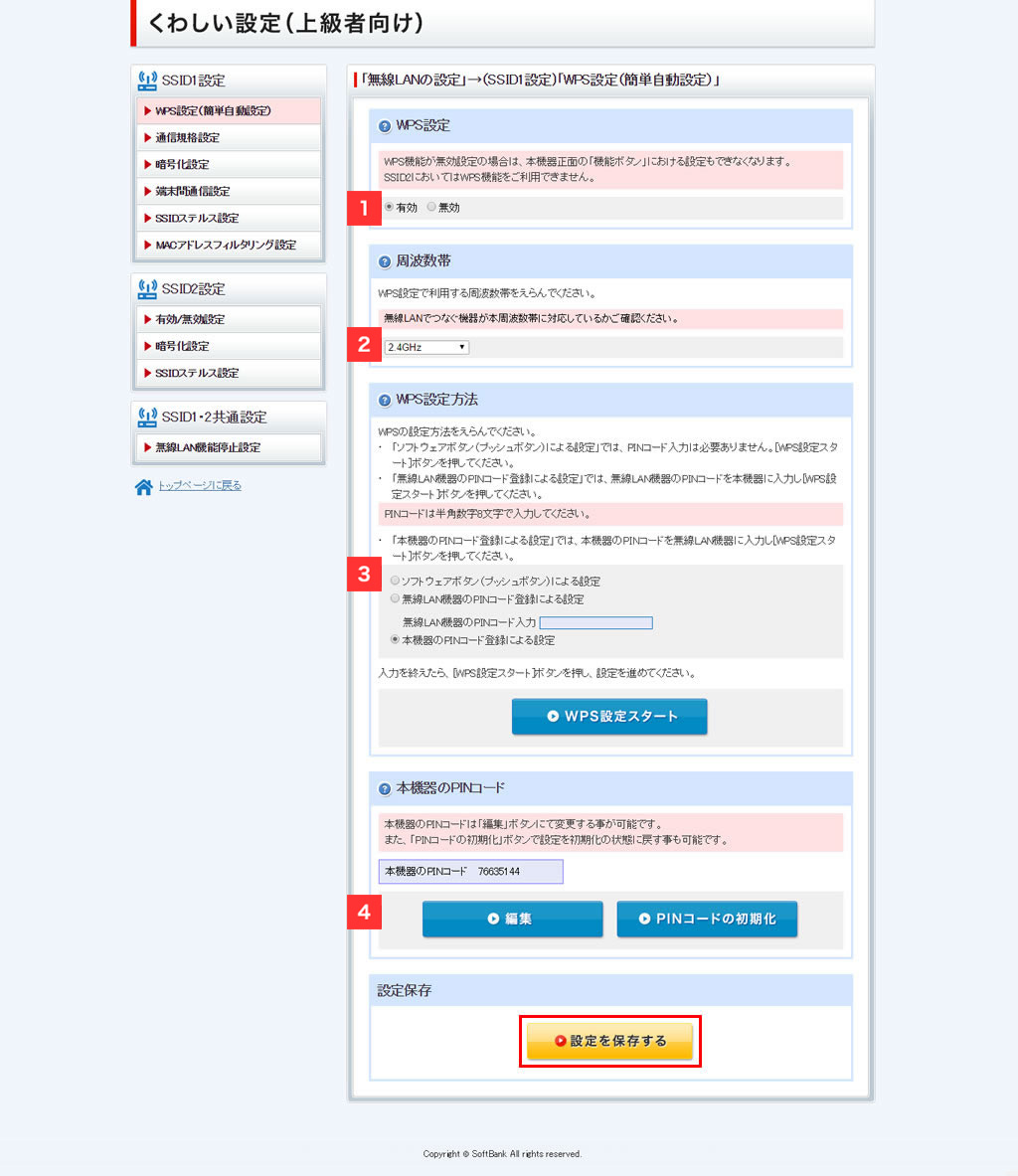 本項ではWPS機能の有効/無効設定および、設定方式の選択ができます。