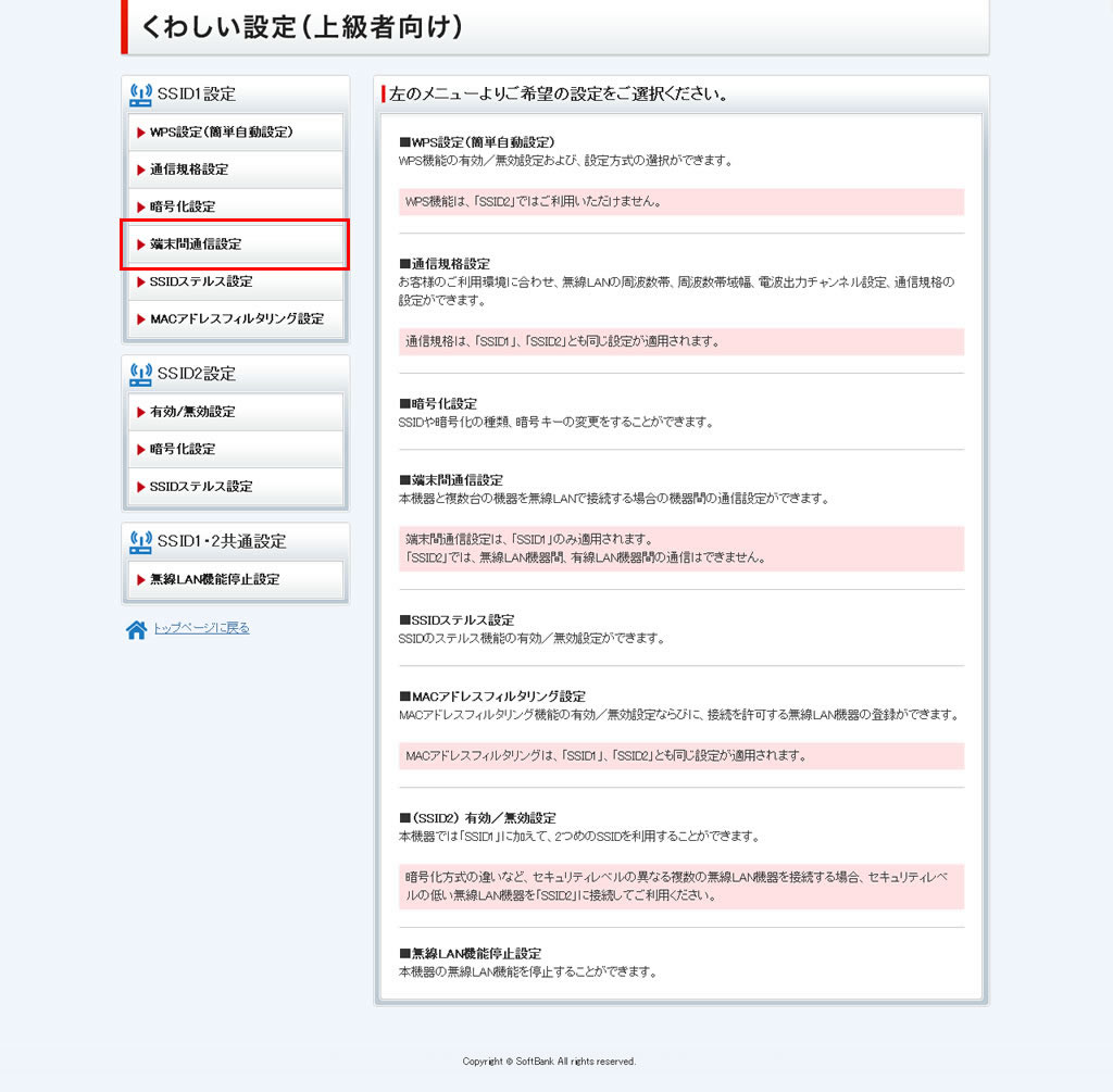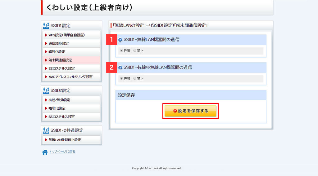 SSID1に接続している無線LAN機器同士の通信、または、有線LANで接続されている機器と、SSID1に接続している無線LAN機器間の通信を許可/禁止する設定ができます。