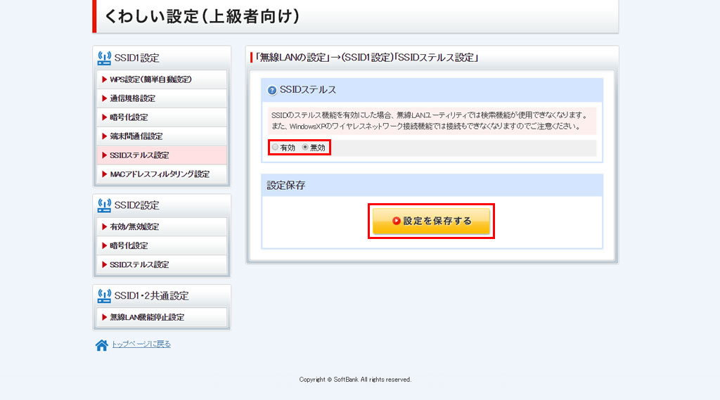 SSIDステルスの有効/無効を選択し、[設定を保存する]をクリックします。