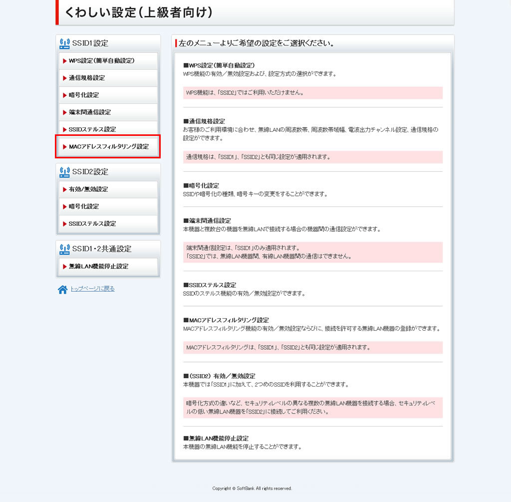 本項では、MACアドレスフィルタリング機能の設定ができます。