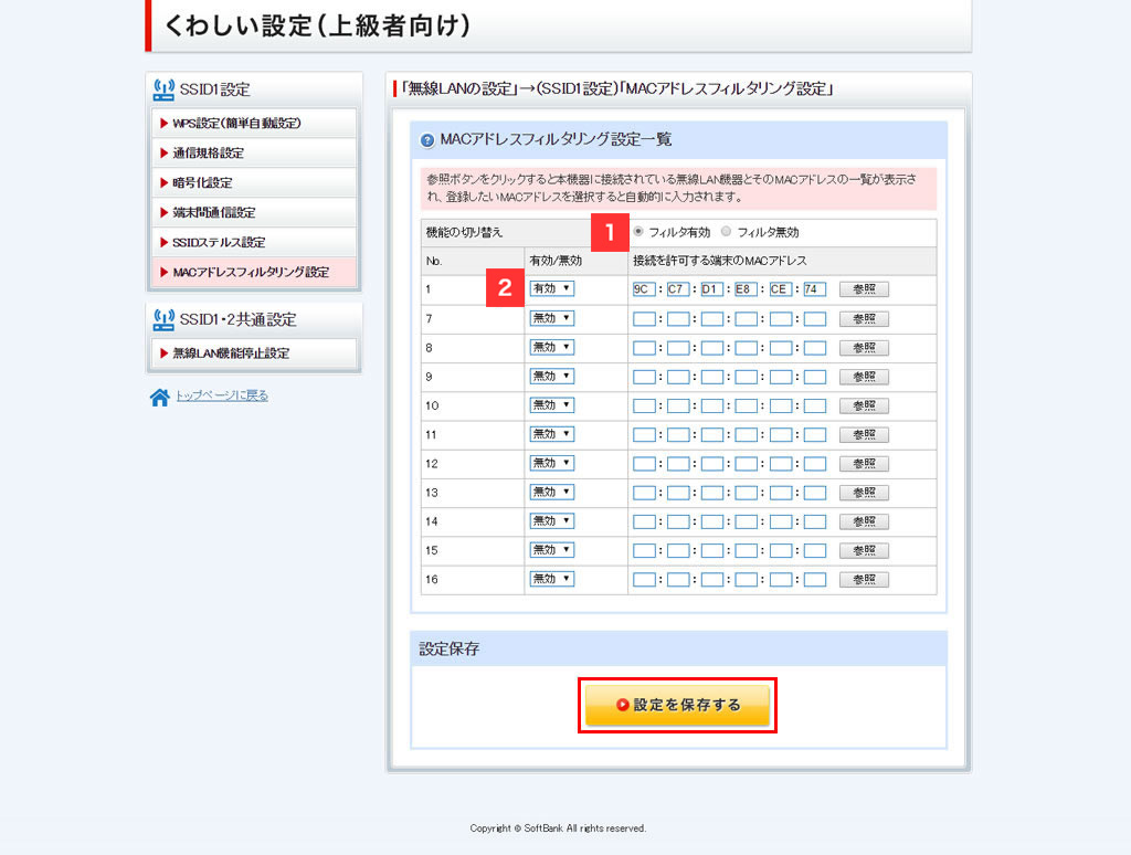MACアドレスフィルタリングが有効な状態で、MACアドレスを1つも設定しない場合はすべての機器から無線LAN接続できなくなりますのでご注意ください。