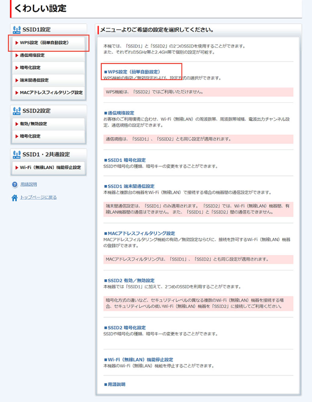 本項ではWPS機能の有効/無効設定および、設定方式の選択ができます。
