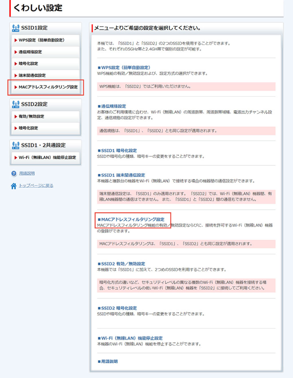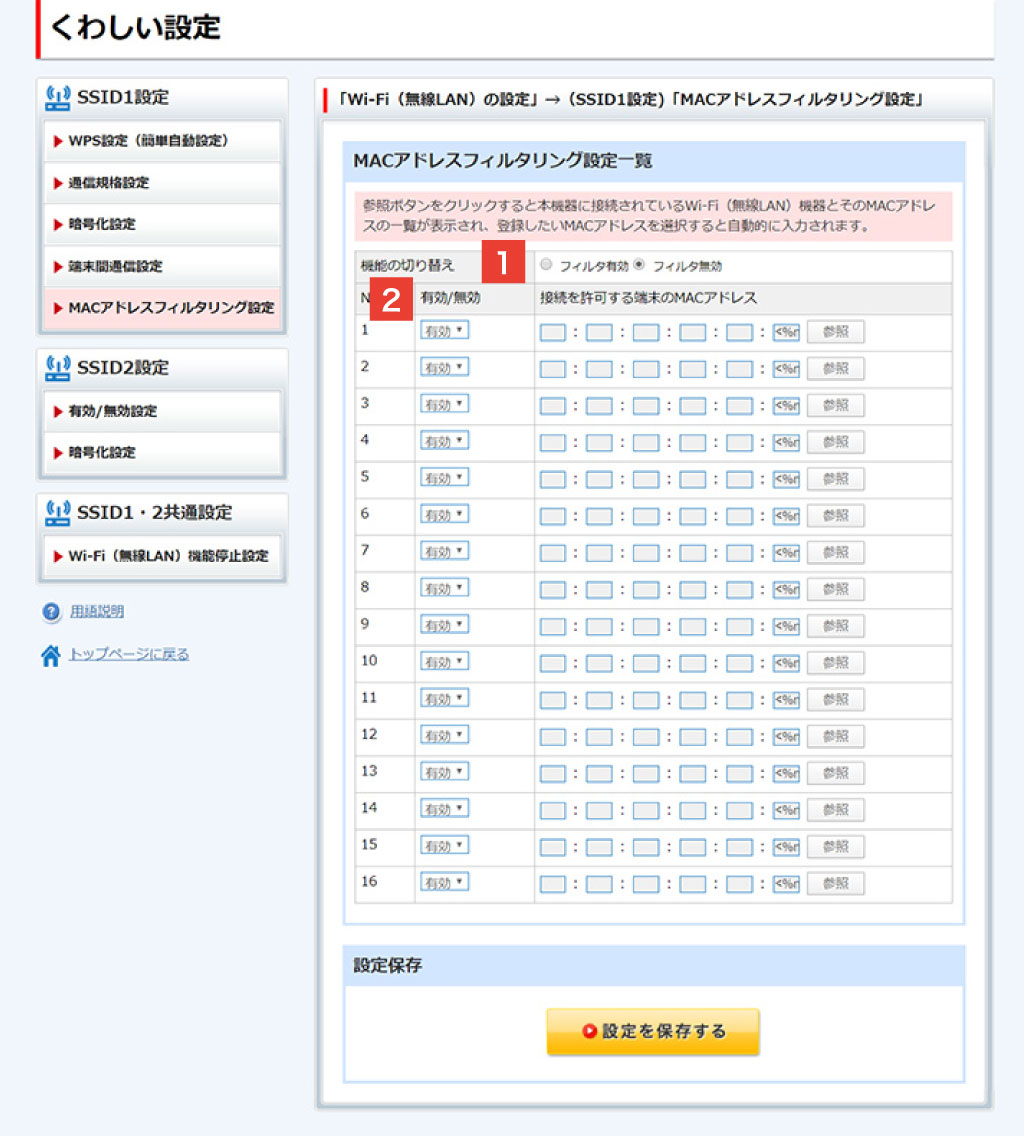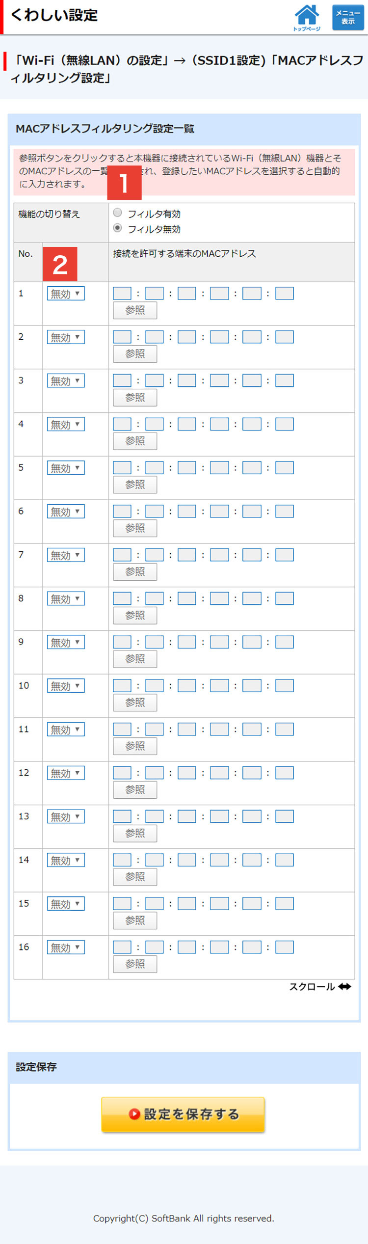 本項では、MACアドレスフィルタリング機能の設定ができます。