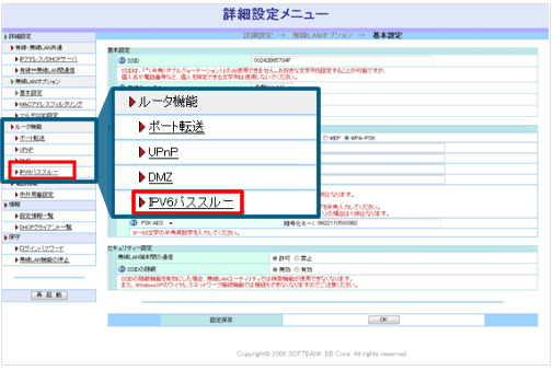左側に表示されたメニューから[IPv6パススルー]をクリックします。