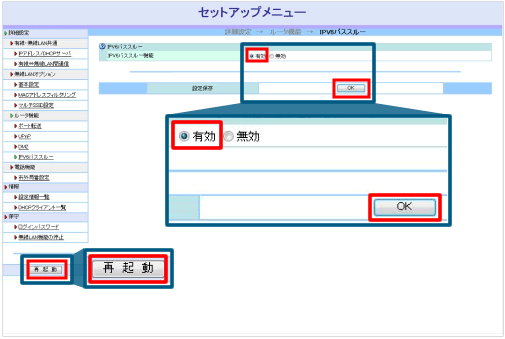 入力が終わりましたら[OK]をクリック後、画面の案内に従って、左側に表示されたメニュー下の[再起動]をクリックします。