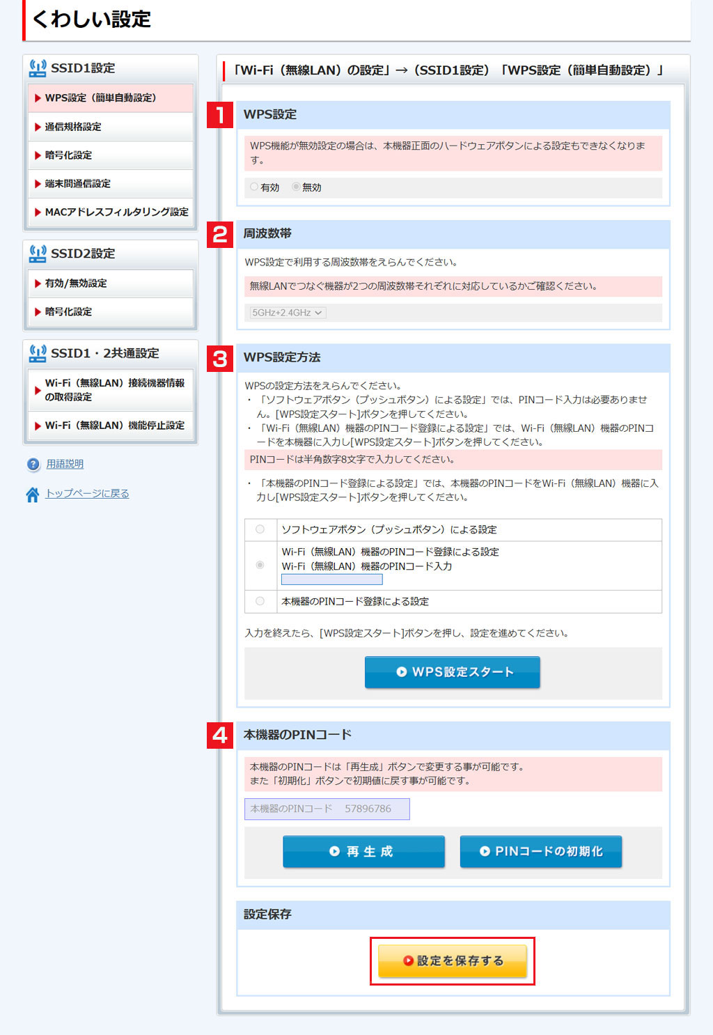 本項ではWPS機能の有効/無効設定および、設定方式の選択ができます。
