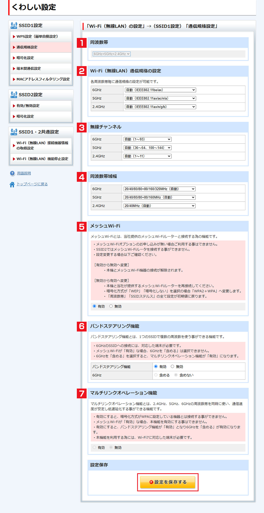 利用する周波数帯(2.4/5/6GHz)、無線チャンネル、周波数帯域幅、通信規格(IEEE802.11be/ax/ac/n/a/g/b)が設定できます。
