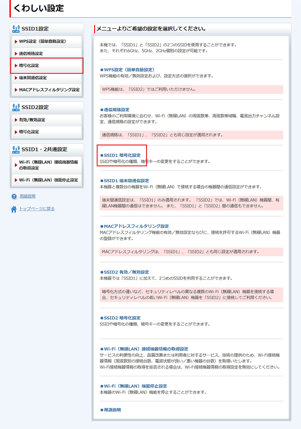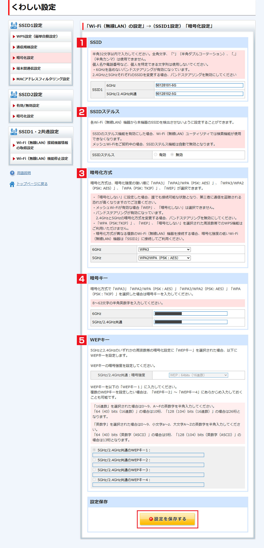 本項では、SSIDや暗号化の種類、暗号キーの変更をすることができます。