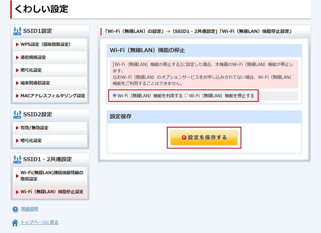 [Wi-Fi(無線LAN)機能を利用する][Wi-FI(無線LAN)機能を停止する]いずれかを選択し、[設定を保存する]をクリックします。