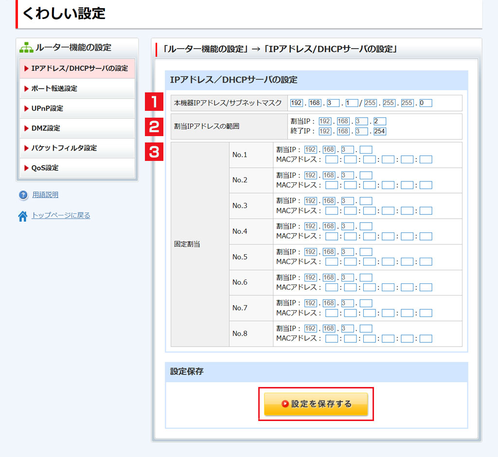 固定で割り当てしたいIPアドレスと、IPアドレスを固定で割り当てたい機器のMACアドレスを設定します。- ・
