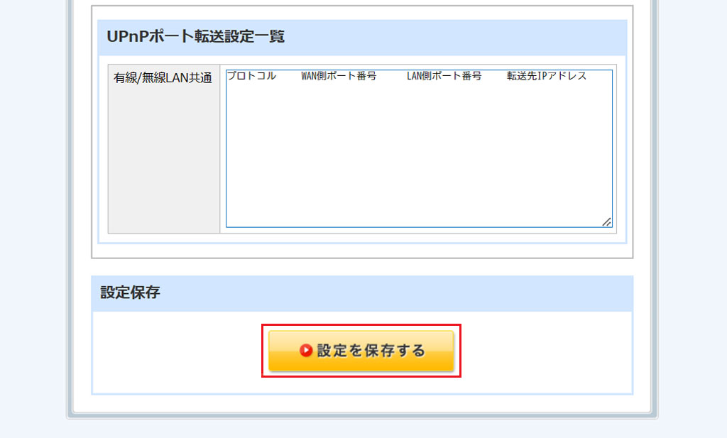 「UPnPで使用中のポートを表示する」で[表示する]を選択すると、UPnP機能により自動でポート転送設定されている情報が表示されます。