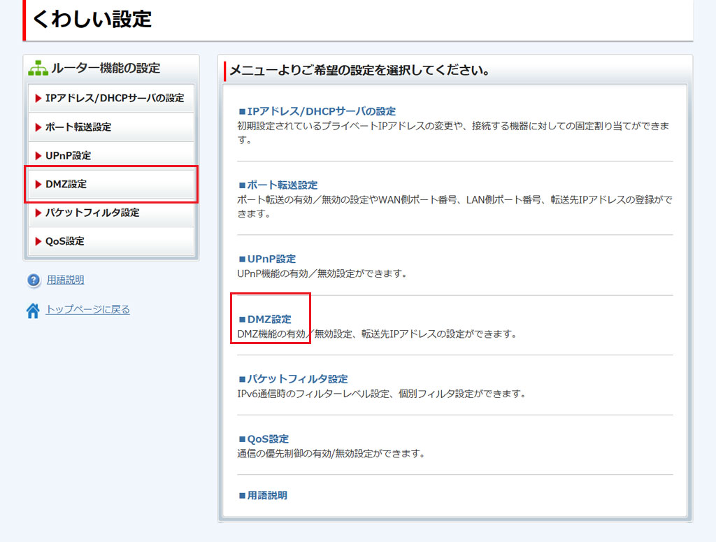 本項では、DMZ機能の有効/無効設定、転送先IPアドレスの設定ができます。