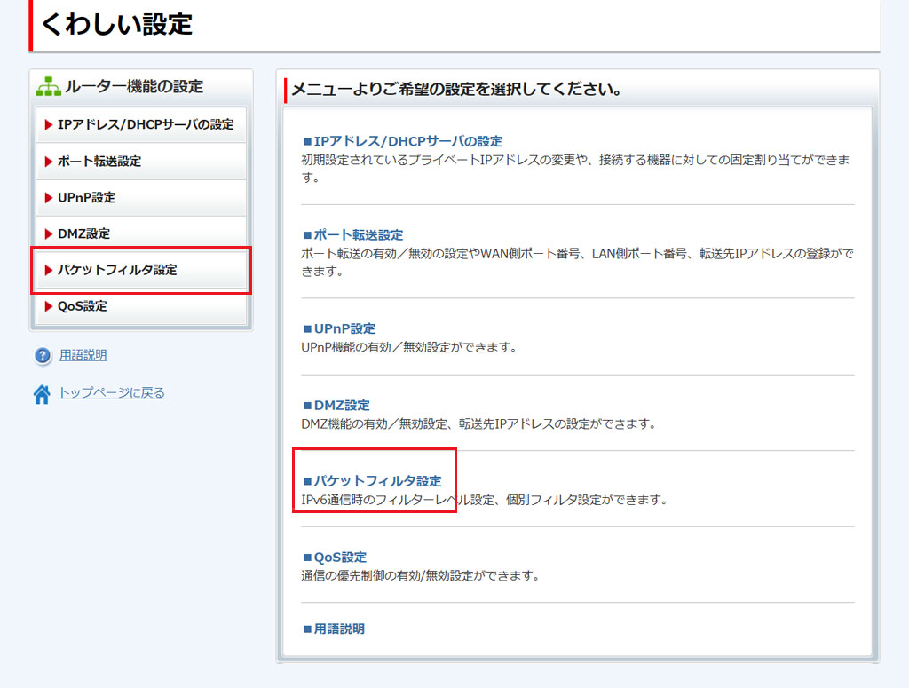 本項では、パケットフィルタに関する設定と、無通信時にSPI機能を維持する時間(SPIタイムアウト)の設定ができます。