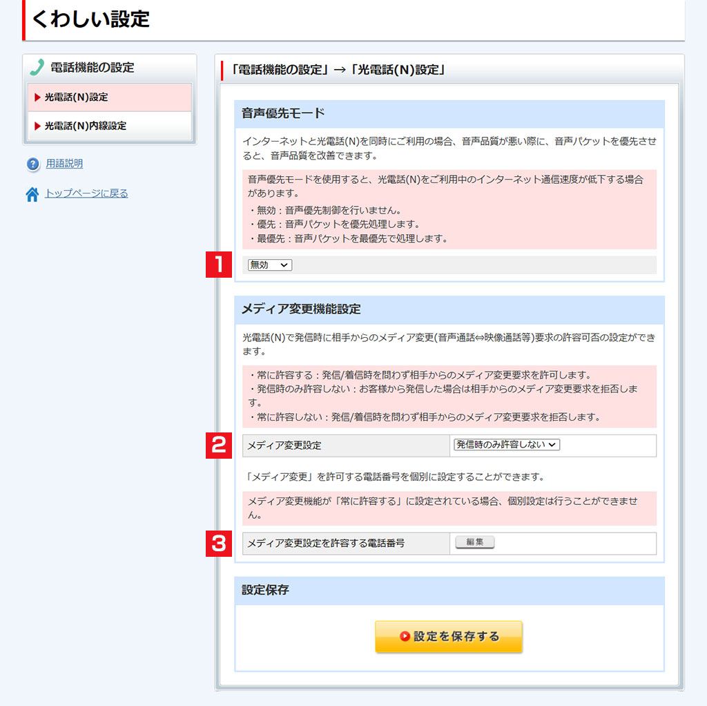 光電話(N)設定の詳細な設定(「音声優先モード」「メディア変更機能設定」)ができます。