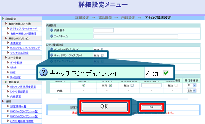 「キャッチホン・ディスプレイ」欄で「有効」を選択し、[OK]ボタンをクリックします。