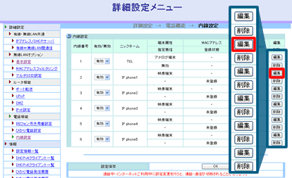 内容を変更したい内線番号の[編集]ボタンをクリックします。