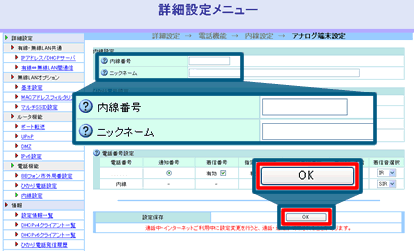 「内線番号」欄に必要事項を入力します。入力が完了したら、[OK]ボタンをクリックします。