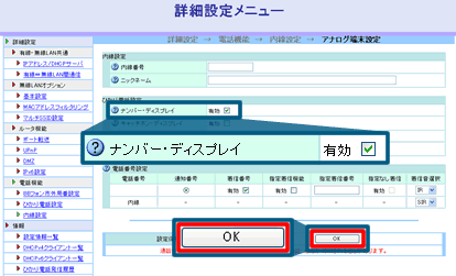 「ナンバー・ディスプレイ」欄で「有効」を選択し、[OK]ボタンをクリックします。