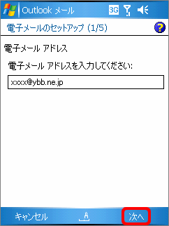 「電子メールのセットアップ(1/5)」が表示されますので、Yahoo! BBのメールアドレスを入力し、「次へ」をタップします。
